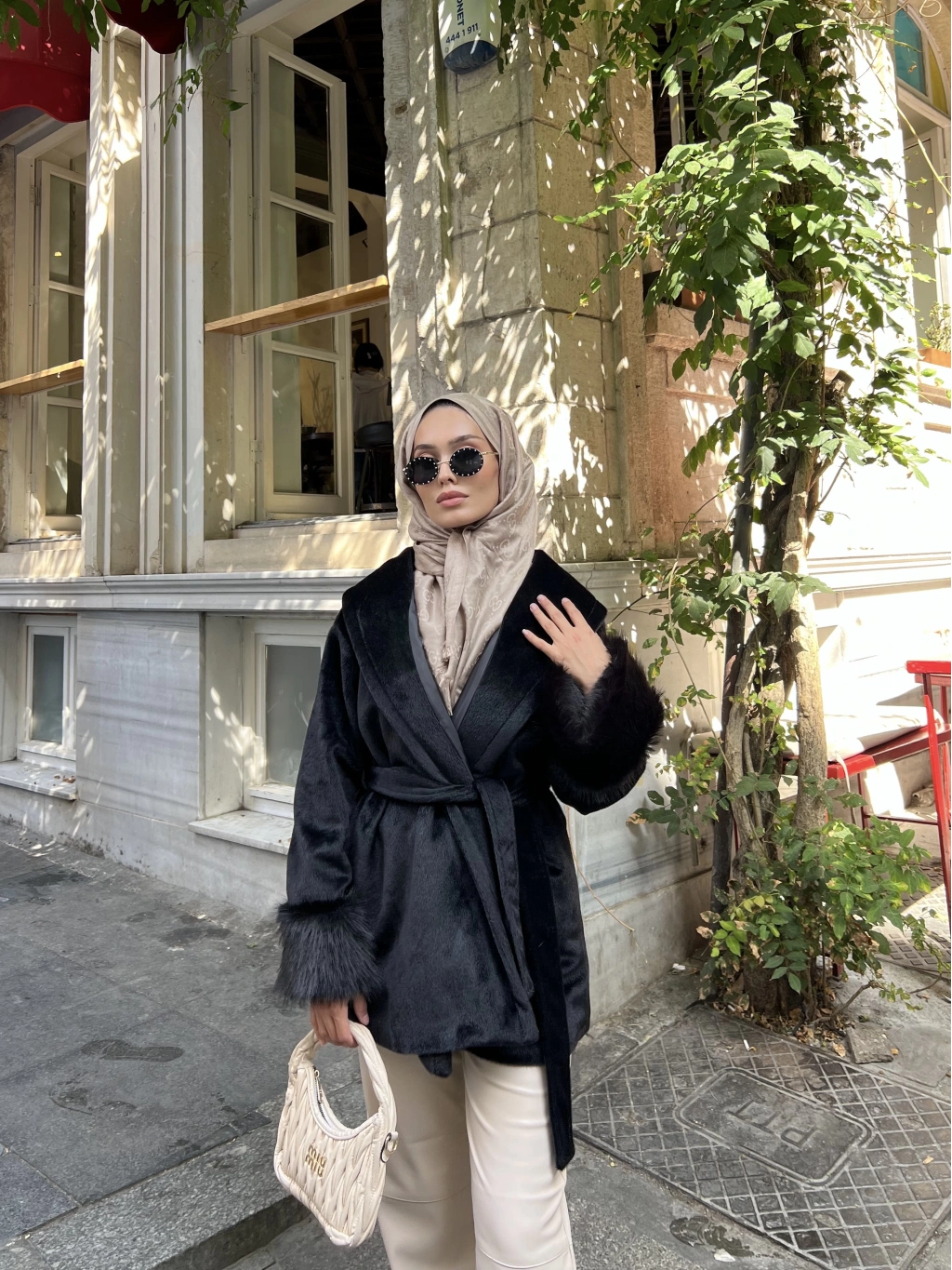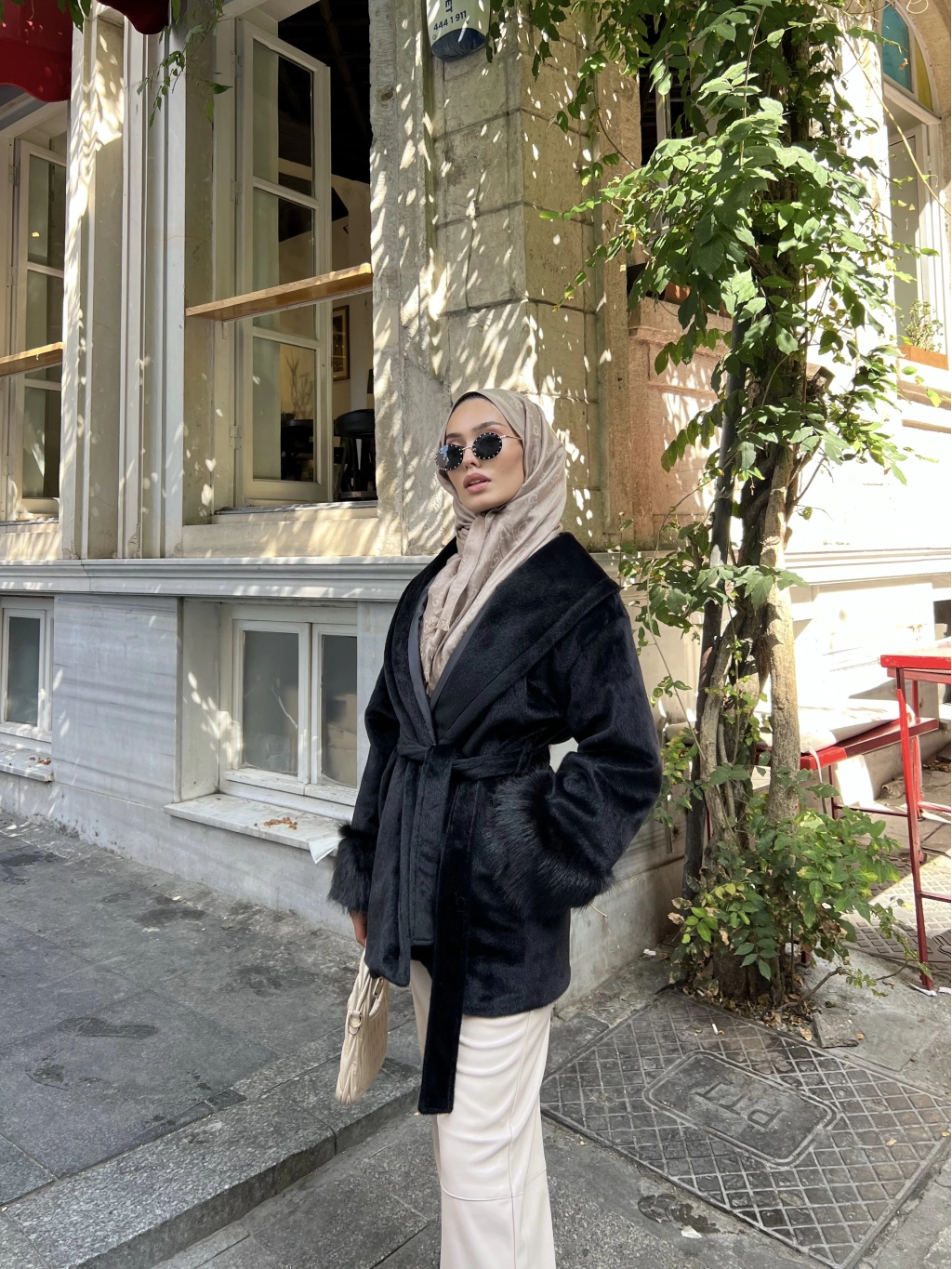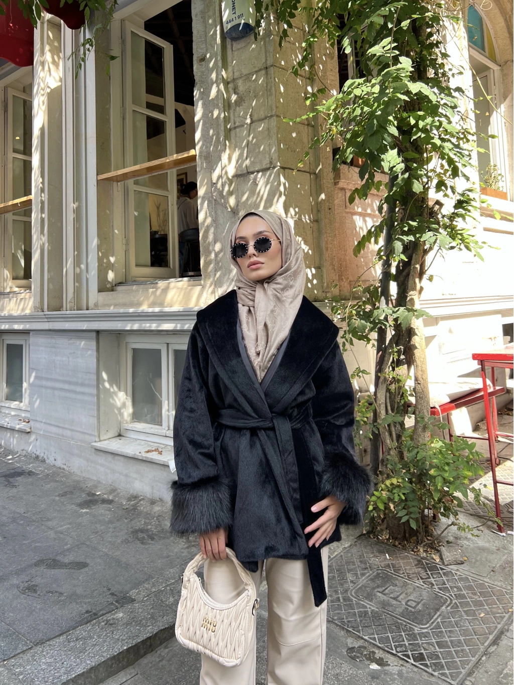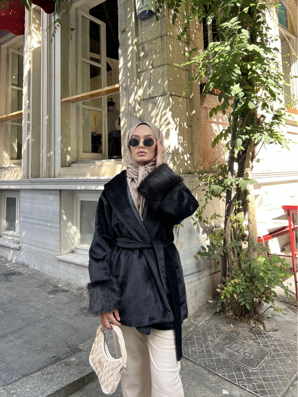 Allo Kolları Kürk Detaylı Mont - Siyah