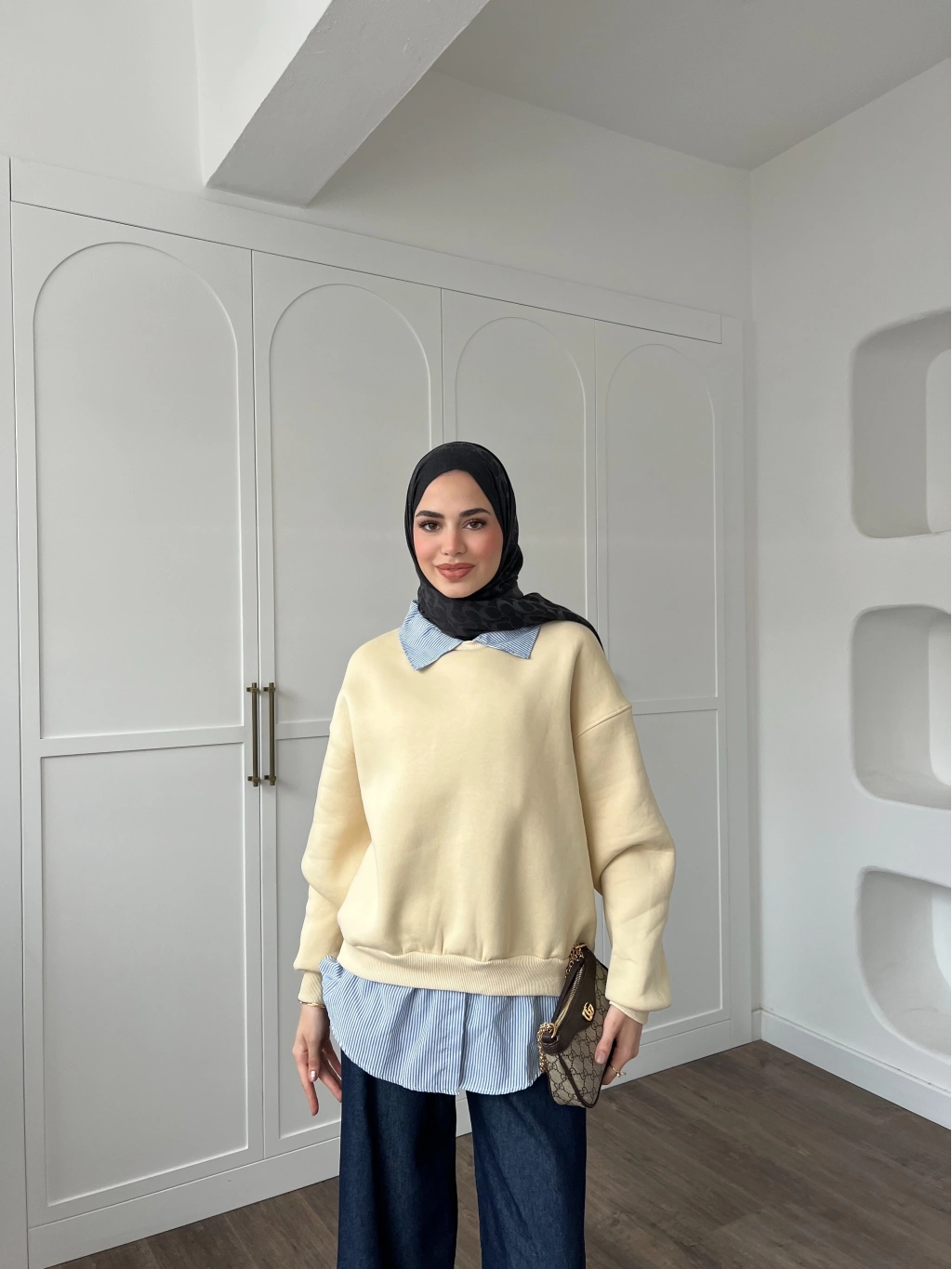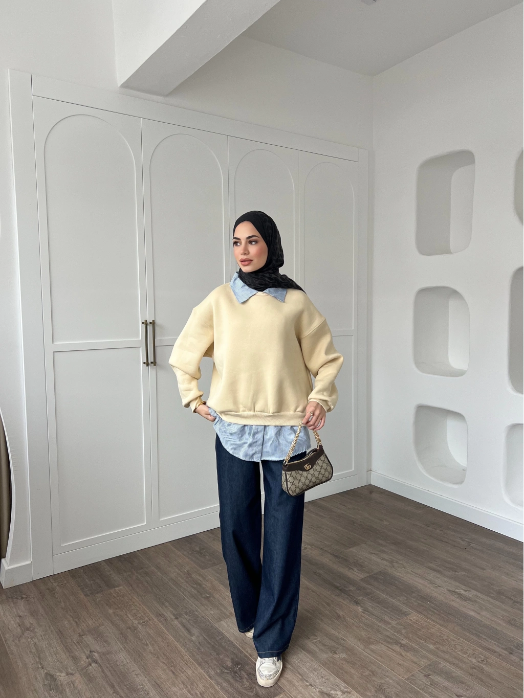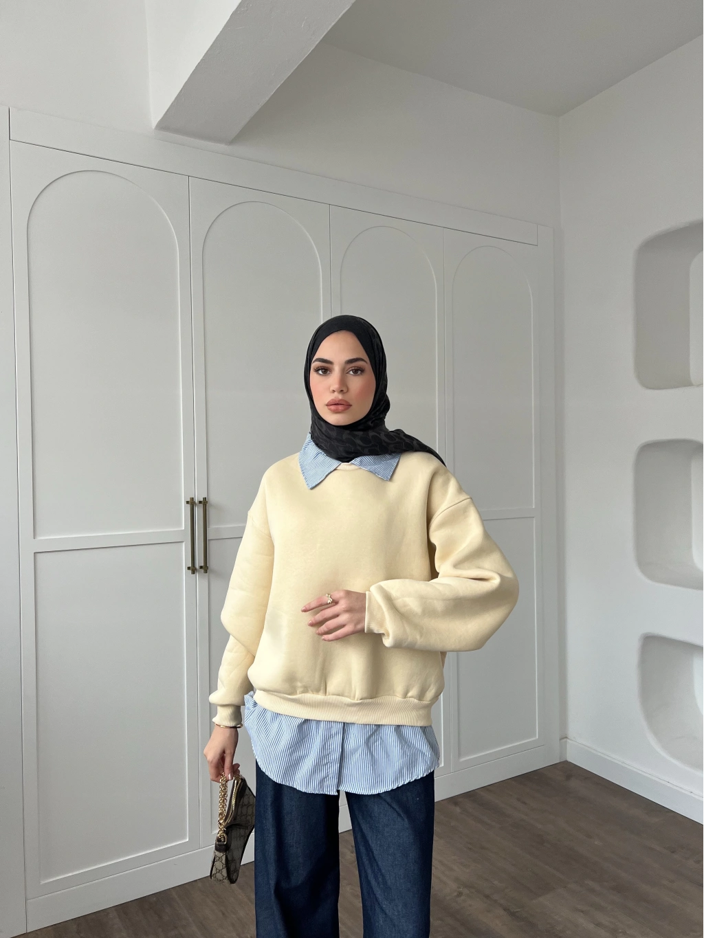 Gömlek Detaylı 3 İplik Sweat - Krem
