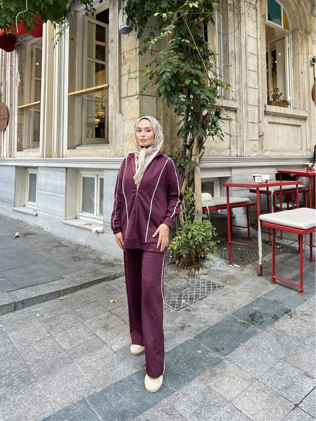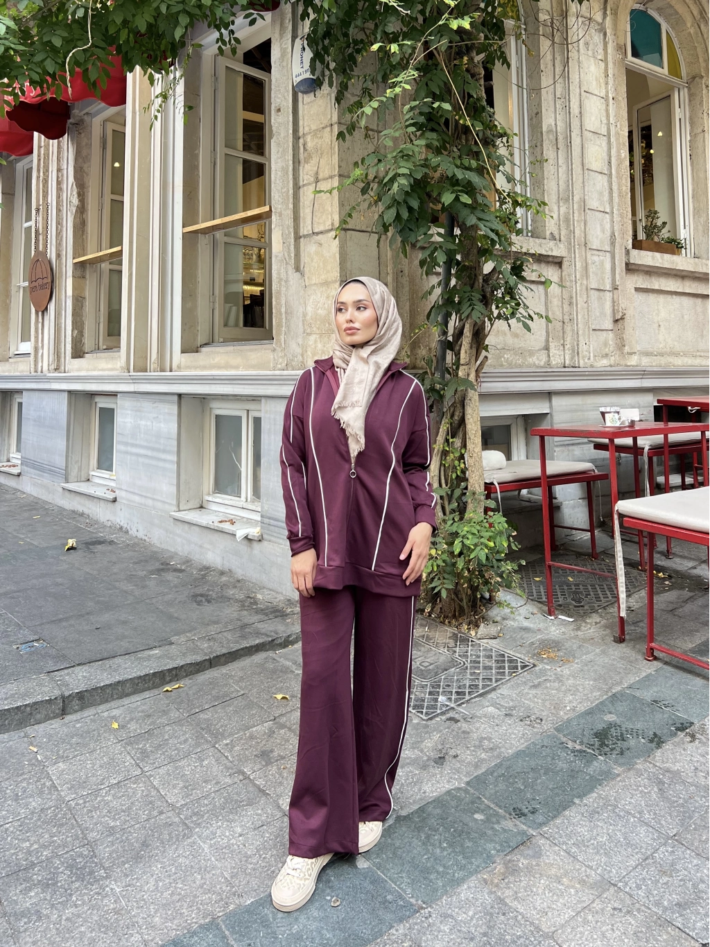 Mehru Çizgi Detaylı Takım - Bordo