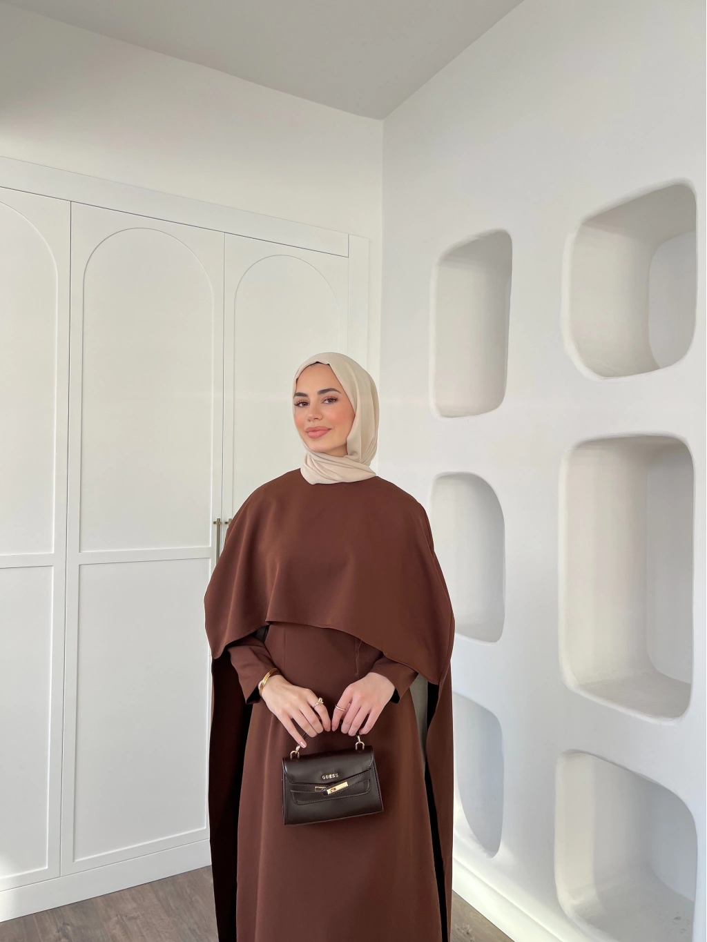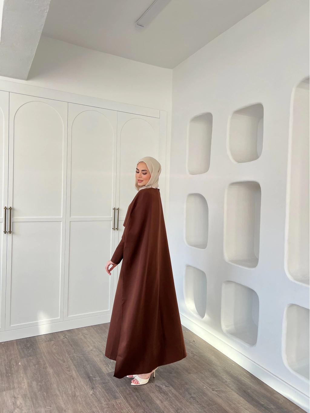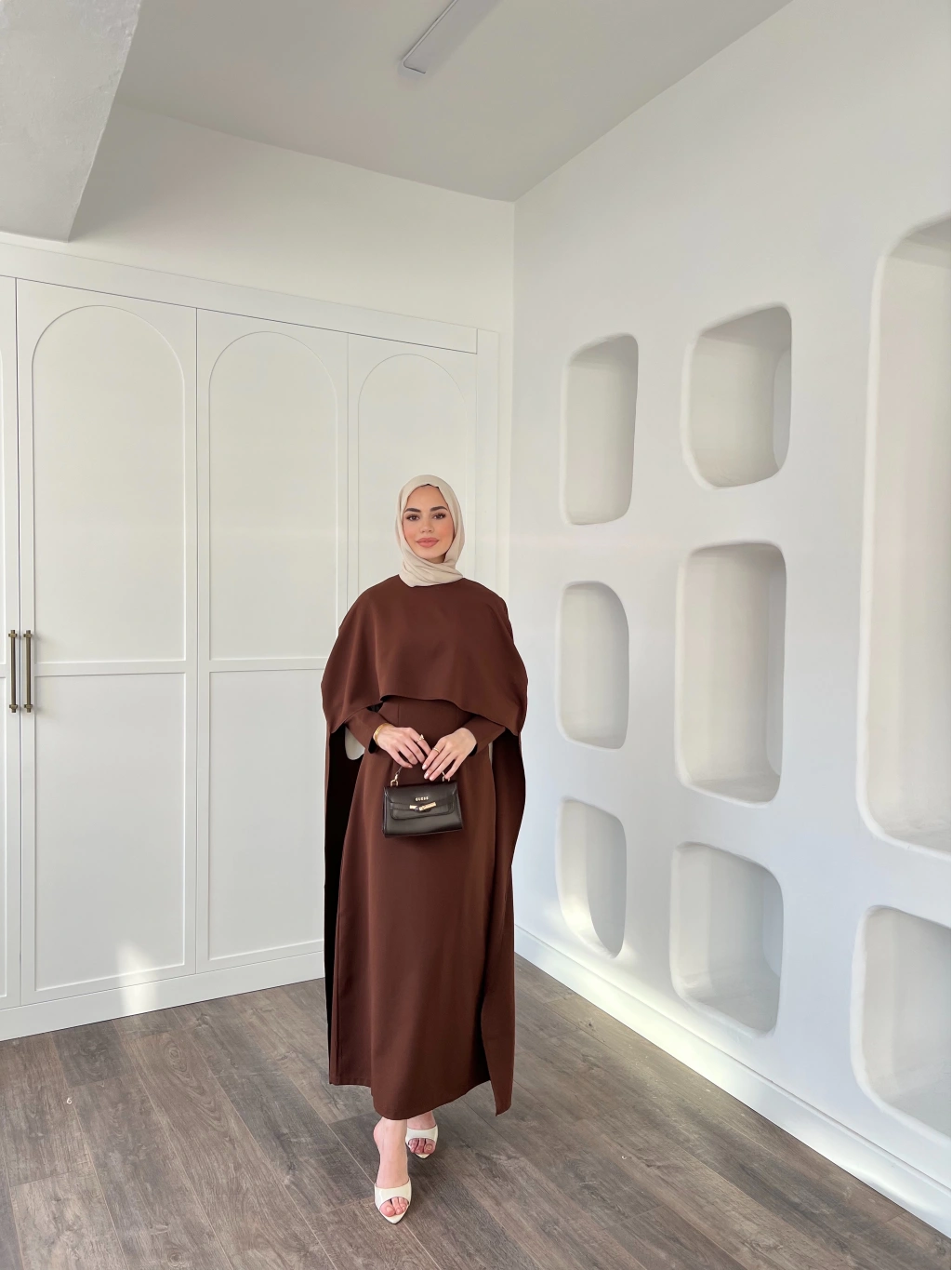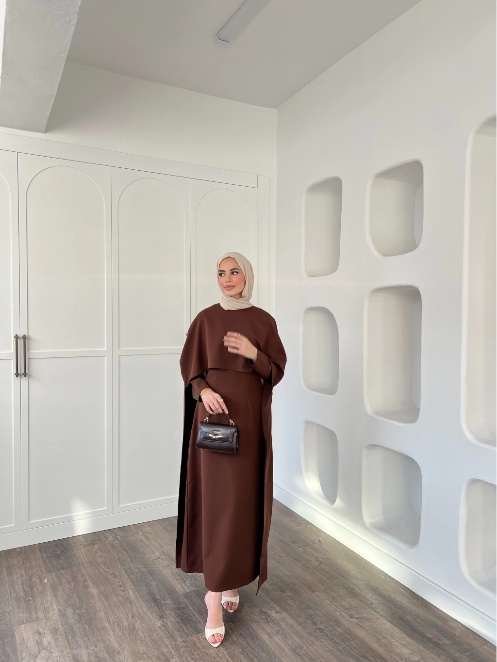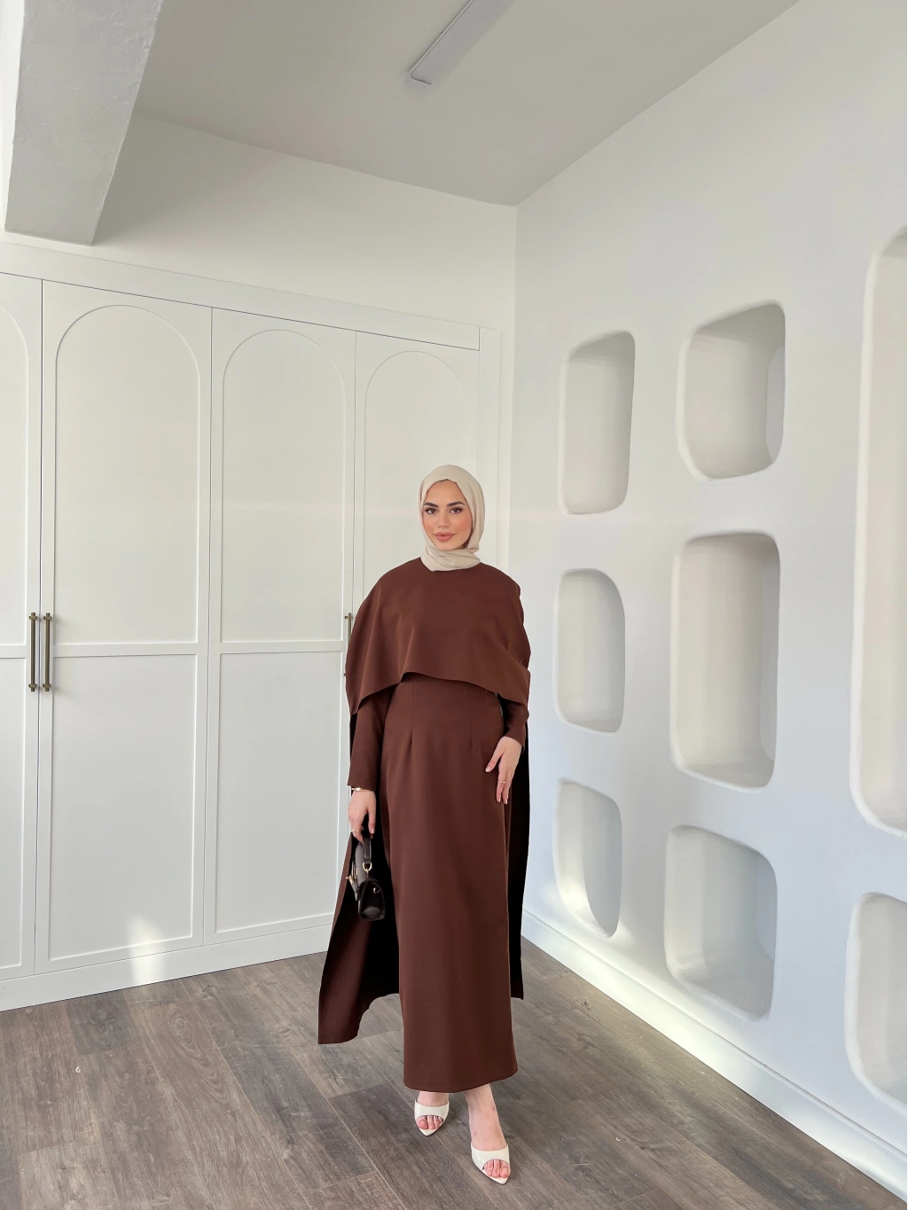 Pelerinli Özge Elbise - Kahve